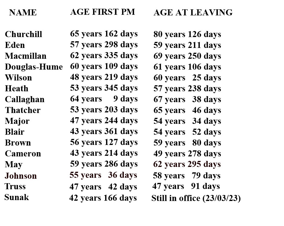 I've put a little table below to show you the ages when Churchill and those who followed him became Prime Minister and then left the position. It's funny because