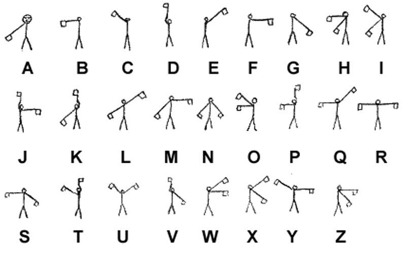 At Easter 1958 members of CND along with other similar organisations took part in a 4 day march from London to Aldermaston, where Britain manufactured its nuclear weapons, to protest. Before the march they wanted to have a symbol to display on the way and they asked a man called Gerald Holton to design something. He came up with the figure on the left that we now all know so well. It was, he said, based on the semaphore flag signals for the letters d (for disarmament) and n (for nuclear). You can check the semaphore alphabet below. Over the years it has come to be a universal symbol for peace and hope.