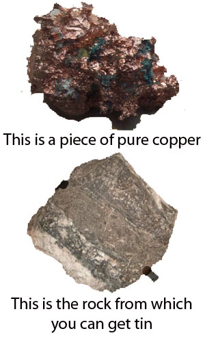 You’ll never believe this but the Bronze Age started because people discovered how to make bronze. Bronze cannot be found in the ground like stone or flint. Bronze is made up of a mixture of tin and copper. It is about 90% copper and 10% tin. Copper is a metal found in rocks. It is a fairly weak metal though quite difficult to break. It can be made into different shapes using your hands.