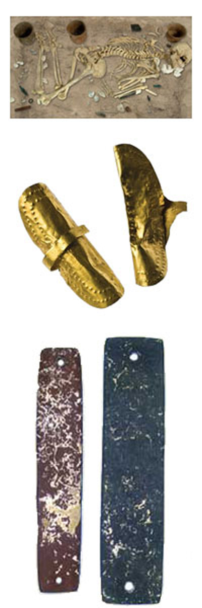 The gold artefacts (an artefact is something man-made and from the past) could have been earrings. It is thought that these earrings, if that is what they were, are the oldest gold objects made in England. Leather bracelets were also found.