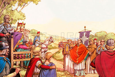 sainted, was sent by the Pope in Rome to re-convert England back to Christianity. He landed on the Kent coast and was greeted by the local king, Æthelberht